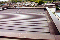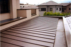 | ※1階スラブ屋根の雨漏り対策として建物全体の外観を損なわない様パラペット内で納めました。鉄板では10年位の寿命のため多少割高にはなりますがカラーステンレス板で堅平葺き施工としました。お客さまも「これで半永久的に安心だ」と納得されておられました。 | ||
